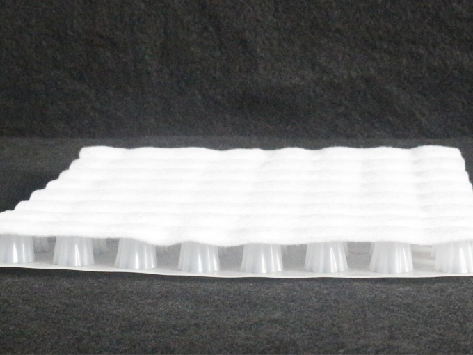 ②紹介:高分子防護排水異型シート自粘土工布は高分子防護排水異型シートの突起表面に接着濾過用濾水布を被覆して構成されている。高分子防護排水異型シートは高密度ポリエチレン純白原料から、溶融状態で押出一体により被覆成形され、立体排水空間と一定支持剛性を有し、かつ液体、ガスがその内を流動できる防護排水材料を形成する。