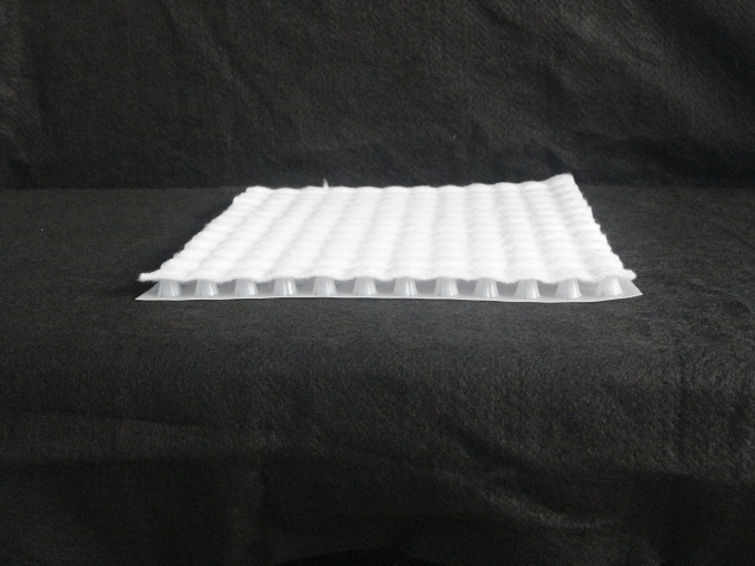 ②紹介:高分子防護排水異型シート自粘土工布は高分子防護排水異型シートの突起表面に接着濾過用濾水布を被覆して構成されている。高分子防護排水異型シートは高密度ポリエチレン純白原料から、溶融状態で押出一体により被覆成形され、立体排水空間と一定支持剛性を有し、かつ液体、ガスがその内を流動できる防護排水材料を形成する。